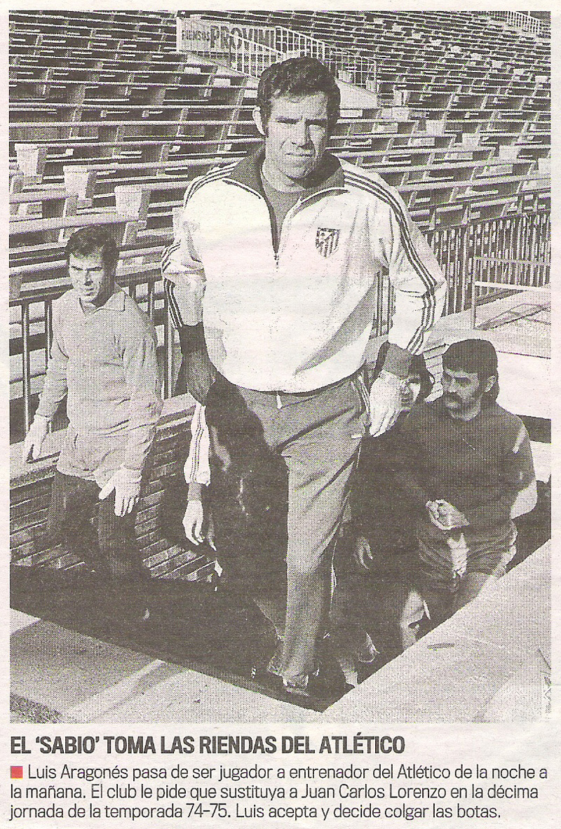 Luis Aragonés pasa de ser jugador a entrenador del Atlético de la noche a la mañana. El club le pide que sustituya a Juan Carlos Lorenzo en la décima jornada de la temporada 1974-75. Luis acepta y decide colgar las botas.